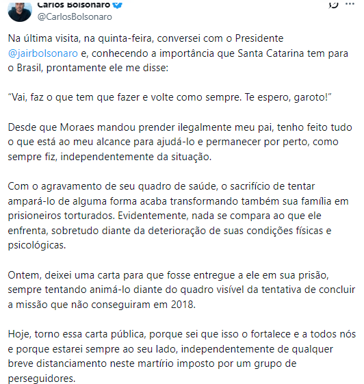 A divulgação, feita pelo X, reforça a narrativa de injustiça frequentemente defendida por aliados. “Você nos ensinou que dignidade não se negocia”, escreveu Carlos em um dos trechos mais repercutidos da carta.