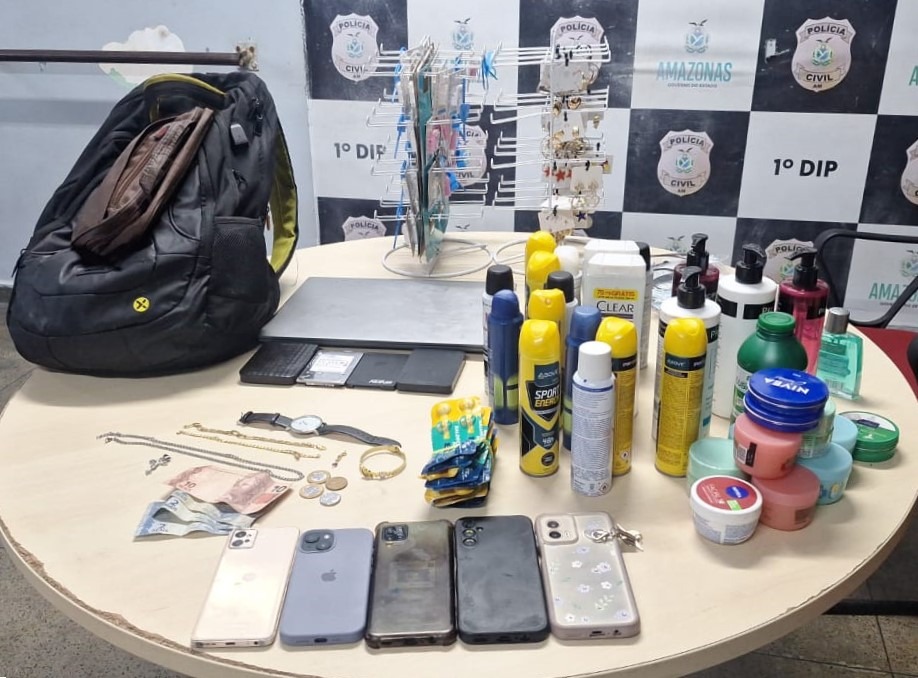 Além da prisão e do veículo recuperado, a PMAM apreendeu cinco celulares, 82 pares de brincos, 14 desodorantes, cosméticos, perfumes, 11 cartelas de medicamentos, quatro HDs, um notebook, bolsa, mochila, joias, fones de ouvido e R$ 18 em dinheiro.