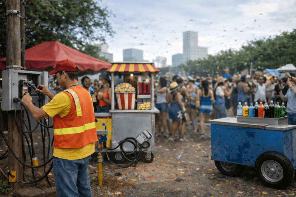 Com a proximidade da folia nos blocos de rua, cresce a movimentação de ambulantes que utilizam equipamentos elétricos para a venda de alimentos, bebidas e outros produtos. Para garantir a segurança de trabalhadores e foliões, órgãos públicos e concessionárias de energia reforçam o alerta sobre a necessidade de solicitar e utilizar corretamente a ligação provisória de energia elétrica.