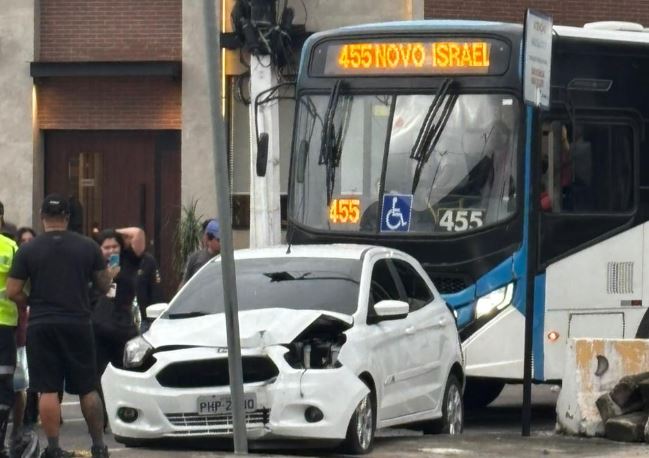 Logo atrás, o ônibus se aproximava e o motorista não conseguiu parar a tempo. O coletivo acabou atingindo a traseira do automóvel, deixando o carro prensado.