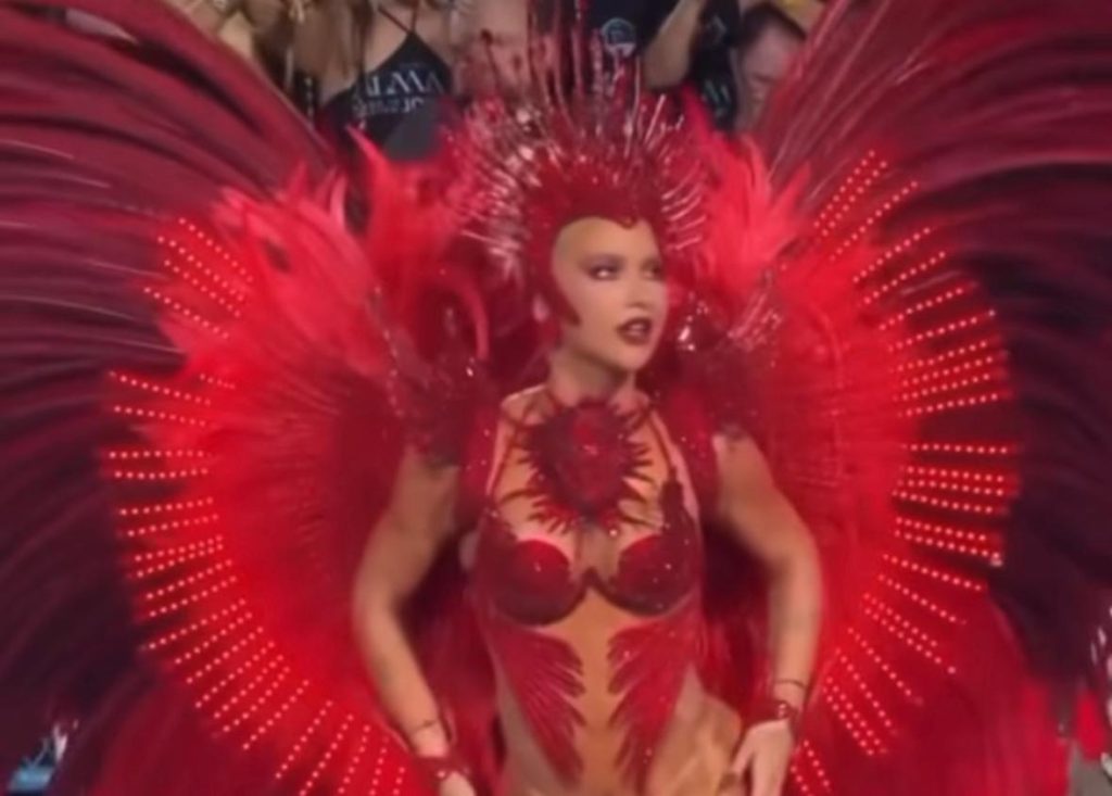 Para o desfile, a influenciadora usou uma fantasia com estética tecnológica, que pesava cerca de 12 quilos. No entanto, parte do costeiro precisou ser retirada após ela relatar dores durante a apresentação.