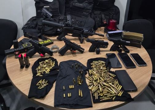 Com o grupo, foram apreendidas armas, munições, celulares, algemas, um fuzil calibre 5.56, pistolas de uso restrito e um bote de alumínio com motor de 300 HP.