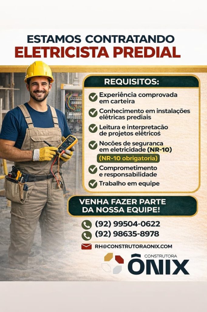 A Construtora Ônix está com oportunidades de emprego abertas para os cargos de carpinteiro, eletricista predial e administrativo/RH, em Manaus. As vagas são destinadas a profissionais com experiência comprovada e que tenham comprometimento e responsabilidade no ambiente de trabalho.