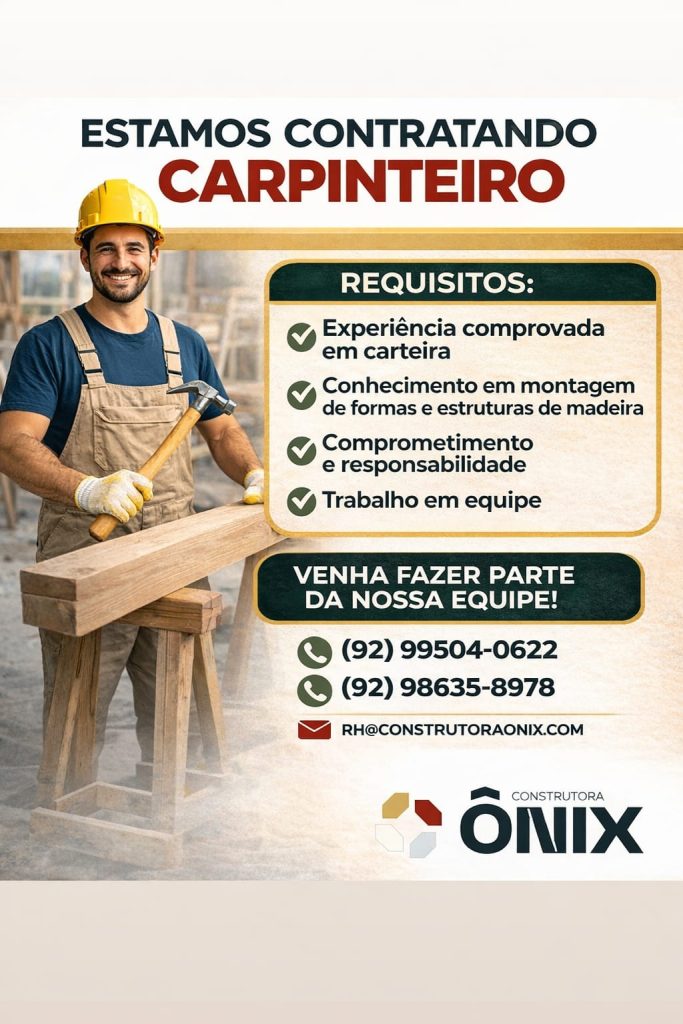 Já para a vaga de carpinteiro, é necessário ter experiência comprovada em carteira, conhecimento em montagem de formas estruturais de madeira, além de comprometimento, responsabilidade e capacidade de trabalhar em equipe.