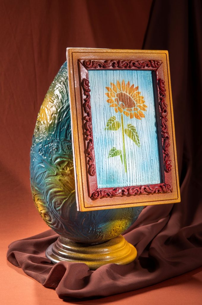 O chocolatier Abner Ivan assina esculturas inspiradas em obras icônicas, como Monalisa (Leonardo da Vinci), Noite Estrelada e Girassol (Van Gogh), além de ovos marmorizados com detalhes dourados pintados à mão e um quadro com a marca do Pátio.
