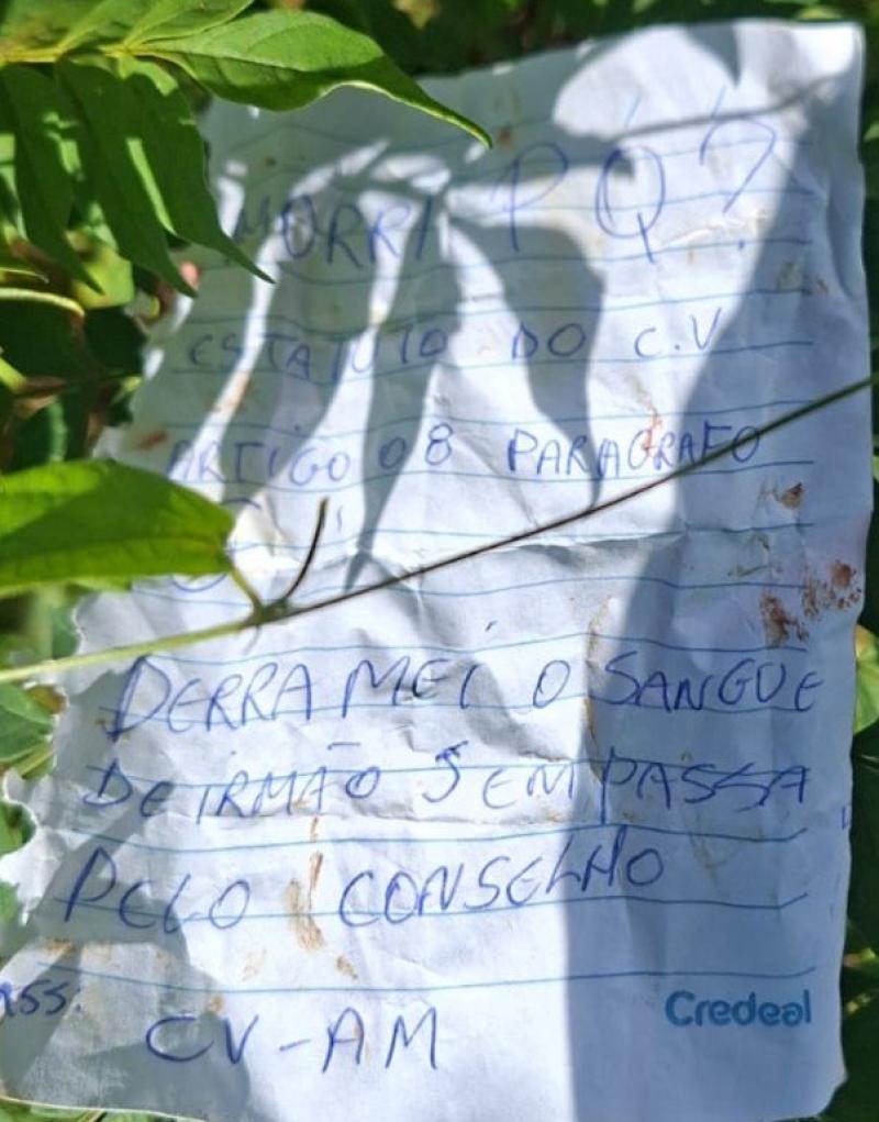O Comando Vermelho (CV) deixou um recado sobre o corpo sem cabeça, de um homem ainda sem identificação, neste domingo (01/03), no Ramal Água Branca 1, localizado no km 32 da rodovia AM-010, zona rural de Manaus.