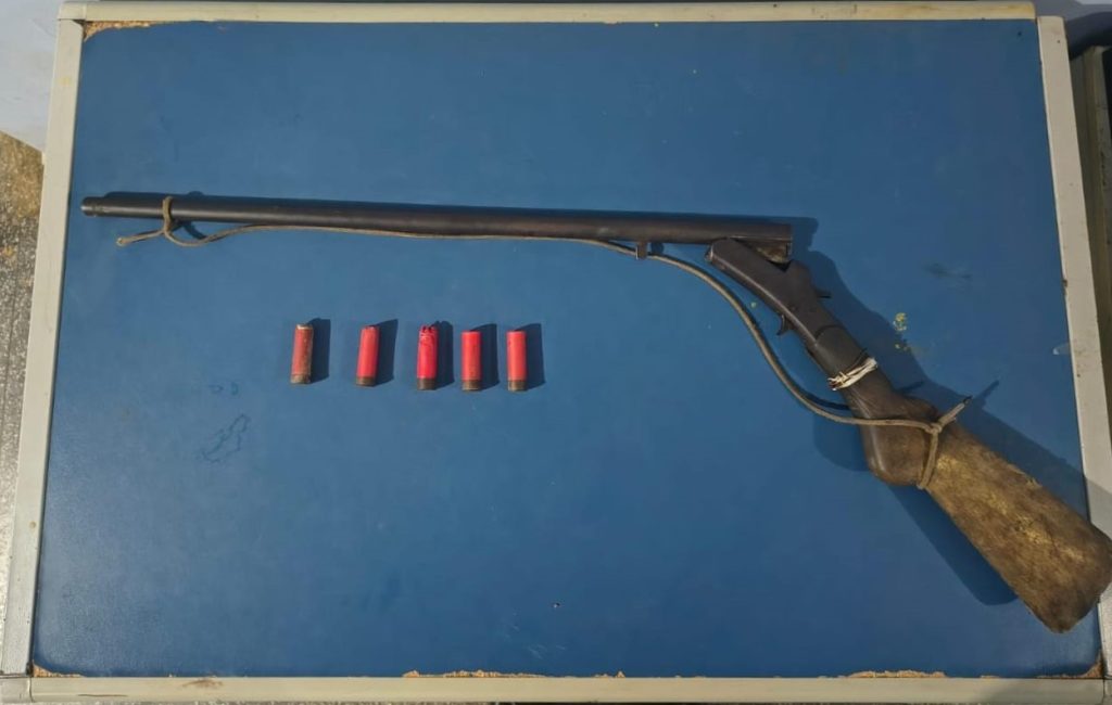 Diante das informações, os policiais militares foram até o endereço e encontraram o pai do suspeito com sangramento visível após ferimento no braço, além de diversos objetos da residência danificados. Durante as diligências, foi localizada uma espingarda calibre 16, juntamente com cinco cartuchos intactos do mesmo calibre.