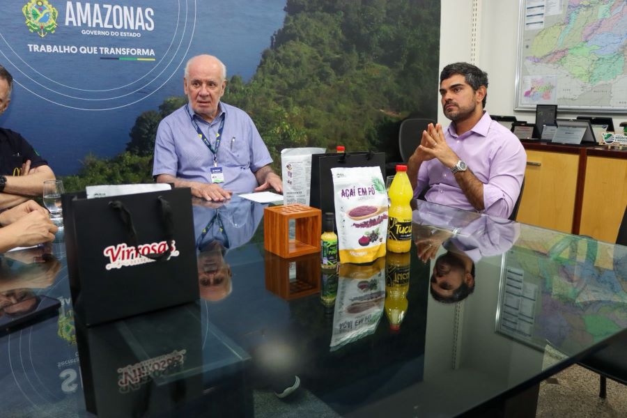 A Secretaria de Estado de Desenvolvimento Econômico, Ciência, Tecnologia e Inovação (Sedecti) recebeu, nesta terça-feira (03/03), o presidente do Sindicato das Indústrias de Alimentação de Manaus (SIAM), Pedro Monteiro, que esteve reunido com o secretário Serafim Corrêa, acompanhado do empresário do setor alimentício Sérgio Band, para tratar de oportunidades e projetos voltados à bioeconomia no Amazonas, com a participação da equipe técnica da pasta.