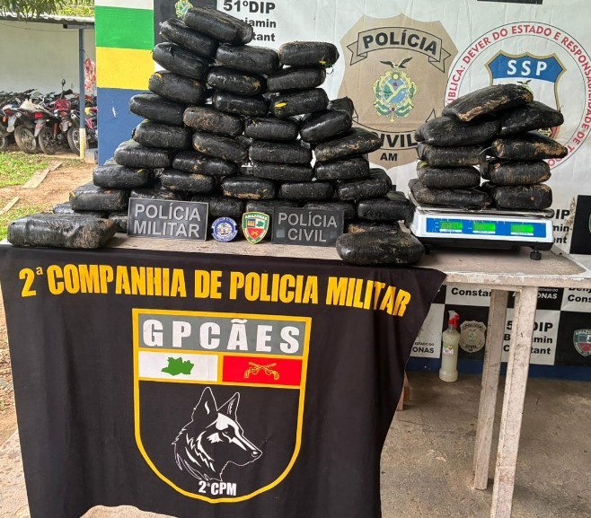 Um cão farejador auxiliou na localização de 59 quilos de maconha avaliados em R$ 1,1 milhão, na terça-feira (3), em uma área de mata no conjunto Alonso Ipuchima, em Benjamin Constant (a 1.121 quilômetros de Manaus).
