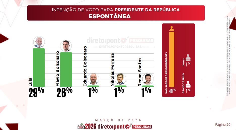 Na pesquisa anterior, divulgada em dezembro, Lula tinha 51%, contra 36% de Flávio Bolsonaro. Em julho de 2025, o presidente aparecia com 48%, enquanto o senador tinha 37%.