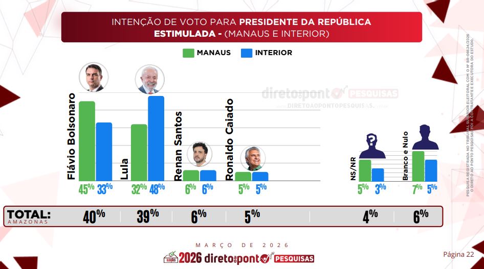Este é o primeiro levantamento do ano realizado pelo Direto ao Ponto Pesquisas sobre a disputa presidencial no Amazonas.