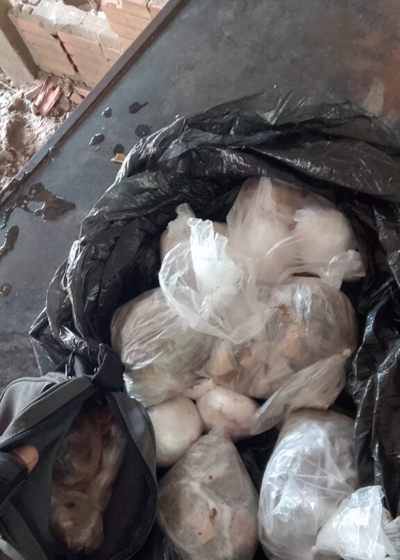 Durante buscas nas proximidades, a equipe também localizou uma sacola preta com mais entorpecentes já embalados para venda.