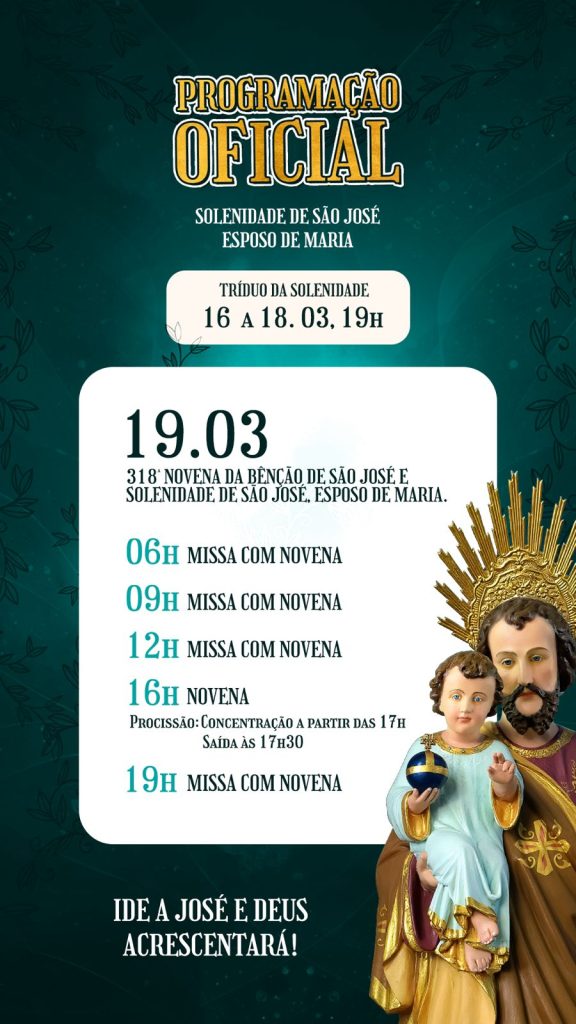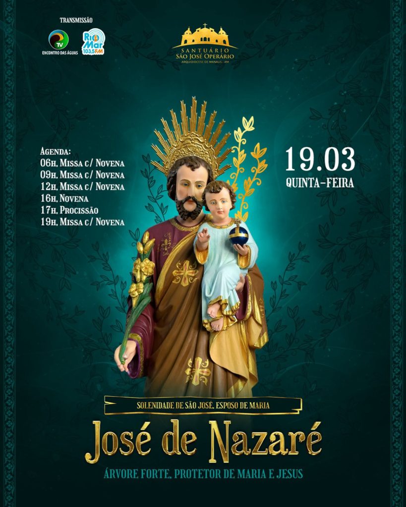 Com o tema “José de Nazaré: Árvore Forte, protetor de Maria e de Jesus”, as novenas acontecem nos horários já conhecidos: 6h, 9h, 12h, 16h e 19h. A partir das 17h, os devotos se concentram para a procissão, com saída prevista para às 17h30.