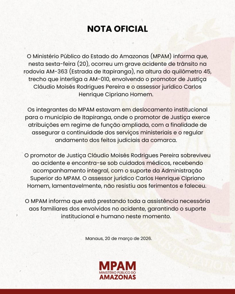 O assessor jurídico Carlos Henrique Cipriano morreu, e o promotor de Justiça Cláudio Moisés Rodrigues Pereira, do Ministério Público do Amazonas (MPAM), ficou ferido, nesta sexta-feira (20/03), após um grave acidente na rodovia AM-363, estrada do município de Itapiranga, no interior do Amazonas.