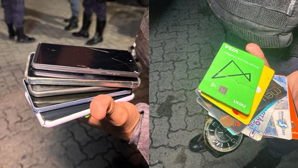 Durante a revista, os policiais encontraram seis celulares de diferentes marcas, nove cartões de crédito e débito, além de dois simulacros de arma de fogo. Questionados sobre a origem dos objetos, os suspeitos não souberam explicar.