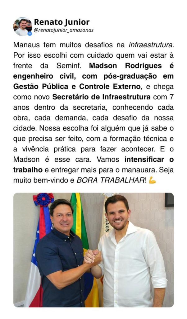 Manaus (AM) – O prefeito de Manaus, Renato Junior, anunciou nesta quarta-feira (8) o novo titular da Secretaria Municipal de Infraestrutura (Seminf). Quem assume a pasta é o engenheiro civil Madson Rodrigues.