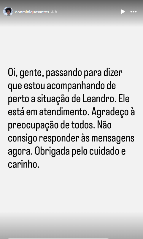 “Oi, gente, passando para dizer que estou acompanhando de perto a situação de Leandro. Ele está em atendimento. Agradeço à preocupação de todos. Não consigo responder às mensagens agora. Obrigada pelo cuidado e carinho. Estou vendo muita desinformação circulando e isso é muito sério”, escreveu ela no story do Instagram.