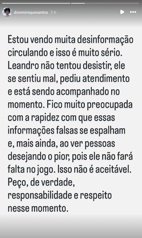 Donminique reforçou: “Leandro não tentou desistir, ele se sentiu mal, pediu atendimento e está sendo acompanhado no momento”.