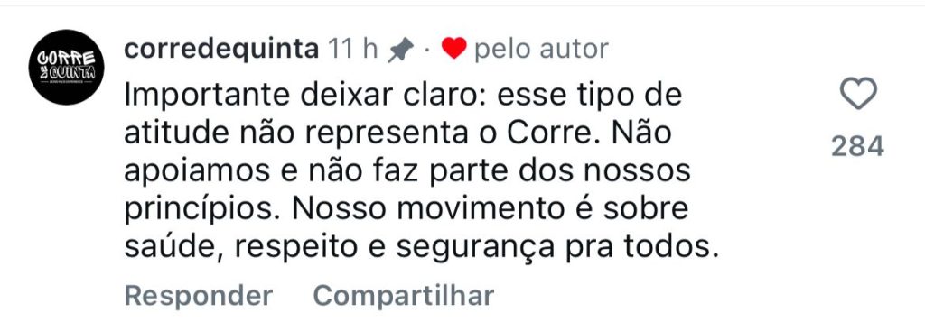 Em uma publicação nas redes sociais, a organização do evento informou que “esse tipo de atitude não representa o Corre”.