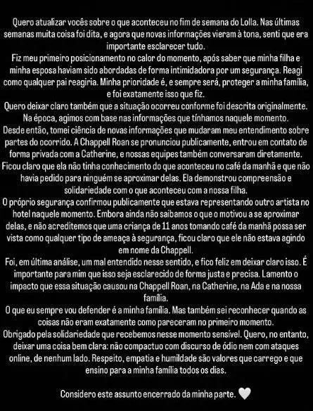 Fiz meu primeiro posicionamento no calor do momento, após saber que minha filha e minha esposa haviam sido abordadas de forma intimidadora por um segurança. Reagi como qualquer pai reagiria. Minha prioridade é, e sempre será, proteger a minha família, e foi exatamente isso que fiz. Quero deixar claro também que a situação ocorreu conforme foi descrita originalmente.