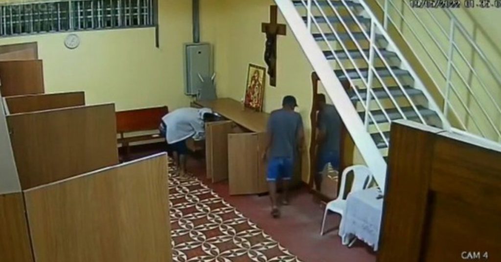 Eles invadiram a igreja e a secretaria do templo religioso, depois de arrombar o portão de ferro, retirando o “miolo” da fechadura. Toda a ação foi registrada pelas câmeras de segurança.