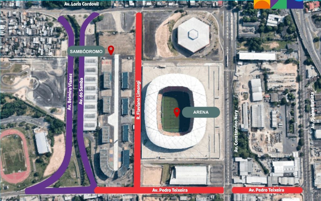 A rua Jornalista Flaviano Limongi, que fica entre a arena da Amazônia e o sambódromo, será fechada no trecho entre a avenida Lóris Cordovil até a avenida Pedro Teixeira, das 7h até as 21h.