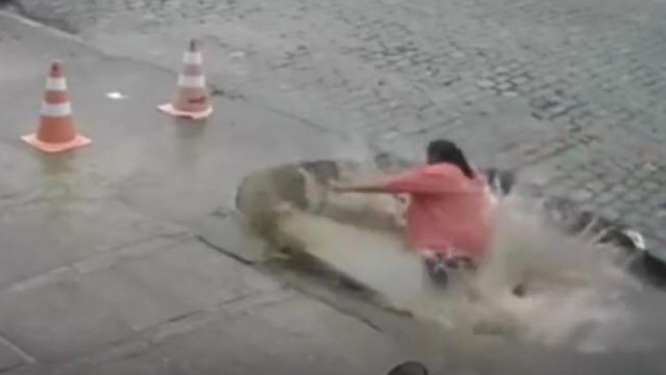 Fortaleza (CE) – Câmeras de segurança de um estabelecimento no centro de Cascavel (CE) registraram o momento no qual uma funcionária pública da cidade caiu em uma cratera que se abriu sob os pés dela.
