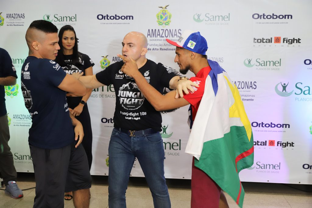 A pesagem do Jungle Fight 108 ocorreu na tarde de sábado (18), no Da Vinci Hotel, em Manaus. O clima estava para lá de quente no momento da encarada. E o momento mais tenso foi na pesagem de Maurício Almeida e Rock Neto Alves, que se estranharam e precisaram ser separados pelo staff do evento.