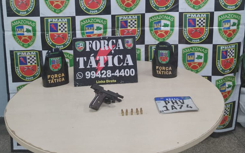 Foi localizada uma pistola calibre 380 com numeração suprimida, além de 10 munições intactas com a dupla. Os suspeitos receberam voz de prisão em flagrante.