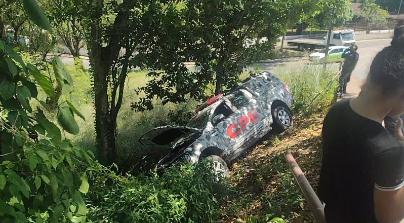 O condutor perdeu o controle da direção e o carro caiu em uma área de mata. Apesar do susto, nenhum policial ficou ferido.