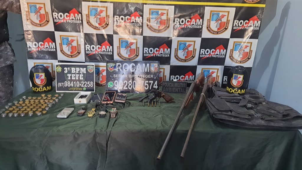 Tefé (AM) – Dois “piratas de rio”, foram presos na tarde desta quinta-feira (18), por volta das 17h, em uma comunidade na zona rural de Tefé (distante 522 quilômetros de Manaus). Eles estavam com armas de fogo, colete balístico e munições.