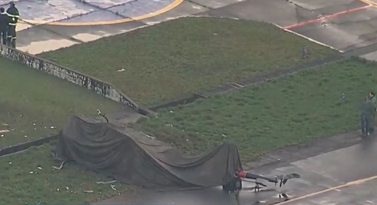 O helicóptero foi coberto e segue no local tombado. Agentes da brigada do Corpo de Bombeiros do próprio aeroporto estão no local e prestam apoio à ocorrência.
