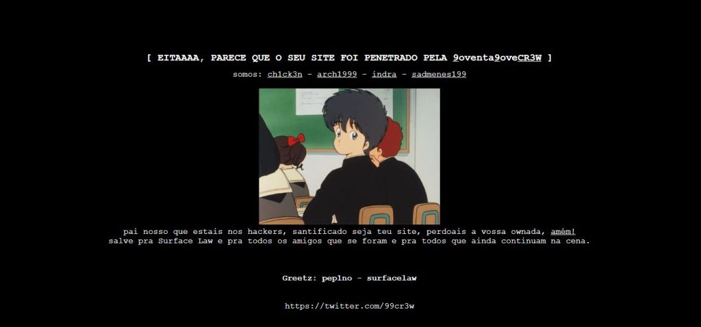 Em seguida, é exibida a mensagem: “pai nosso que estais nos hackers, santificado seja teu site, perdoais a vossa ownada, amém! Salve pra Surface Law e pra todos os amigos que se foram e pra todos que ainda continuam na cena.”