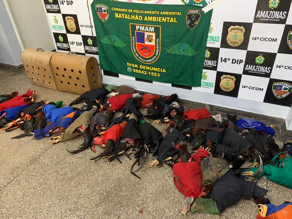 Manaus (AM) – Equipes da Polícia Militar do Amazonas (PM-AM), por meio do Comando de Policiamento Ambiental, detiveram 25 pessoas, neste domingo (25), suspeitas de participação em “rinhas de galo” na Vicinal da Fé, no bairro Distrito Industrial 2, Zona Leste de Manaus. O local contava com mais de 90 galos em gaiolas e caixas.