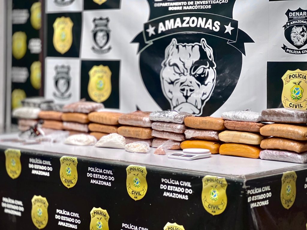 Manaus (AM) – O colombiano Andrés Julián Diosa Osorno, de 47 anos, e Valdemir Moraes da Cruz Santos Júnior, de 34, foram presos na quarta-feira (12), com aproximadamente 30 quilos de drogas, incluindo maconha tipo skunk e cocaína, avaliadas em R$ 600 mil, além de uma arma de fogo calibre 765, munições e uma balança de precisão. A ação ocorreu no bairro Flores, Zona Centro-Sul de Manaus.