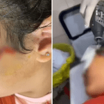 Nas imagens do incidente, o anzol aparece preso à bochecha da menina, próximo à orelha e à linha do cabelo.