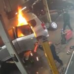 O circuito de câmeras de uma oficina registrou o momento em que um mecânico sem querer incendeia o interior de um carro
