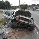 Carro fica destruído ao bater violentamente contra poste em Manaus