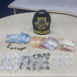 Foram encontradas 54 trouxinhas de drogas, entre cocaína, maconha e oxi; R$ 683 em espécie; dois aparelhos celulares
