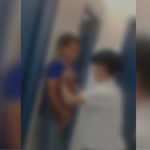 Cena ocorre dentro do banheiro da escola, onde um dos alunos pressiona o peito da criança para induzir o desmaio, enquanto outro filma a situação.