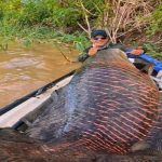 Pirarucu de 2 metros pesando 100 kg é fisgado na Amazônia