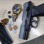 Eles estavam com um simulacro de arma de fogo, munições e entorpecentes, relógio e celulares