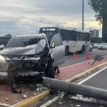 Picape invade canteiro central e derruba poste na Ponta Negra