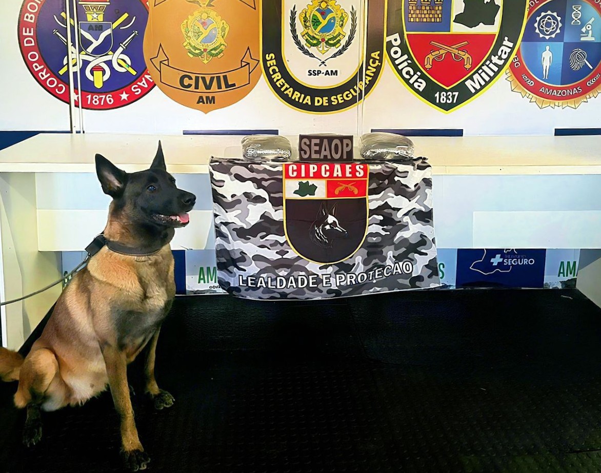 Cadela policial encontra 13 kg de droga em sacos de lixo dentro de embarcação no AM