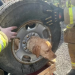 Bombeiros salvam cadela após ficar entalada em roda de veículo