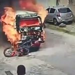 Kombi pegando fogo atropela motociclista; VÍDEO