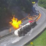 Carreta com combustível tomba, pega fogo e atinge 24 carros em rodovia