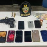 Foram apreendidos um revólver, uma submetralhadora, munições, celulares e drogas