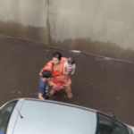 VÍDEO: Com filho no colo, mulher tenta empurrar carro durante chuva em Manaus