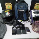 Com os suspeitos, a polícia encontrou quatro celulares, um simulacro de arma de fogo, uma mochila e uma bolsa feminina